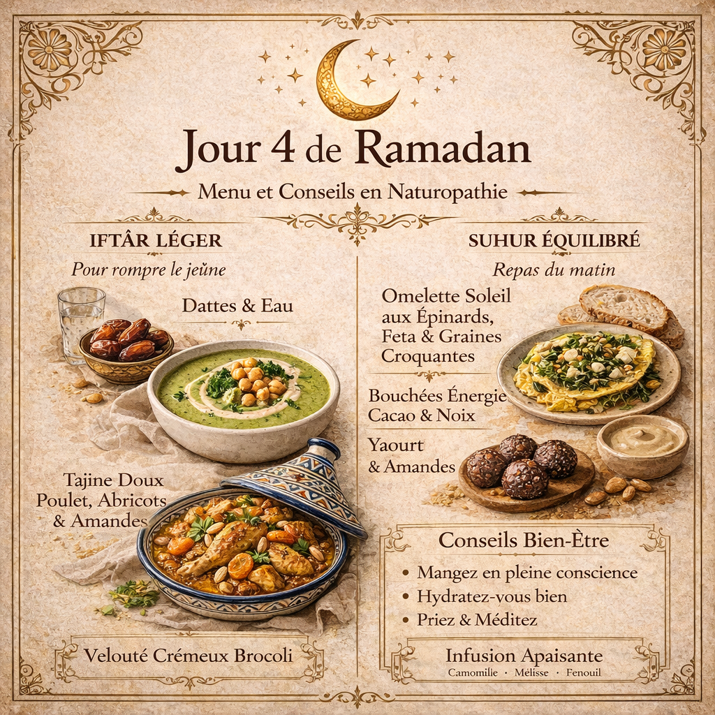 Le quatrième jour du Ramadan est souvent celui où le corps commence réellement à s’adapter au rythme du jeûne. C’est le moment idéal pour soutenir le métabolisme avec des protéines de qualité, des fibres douces et des épices anti-inflammatoires.