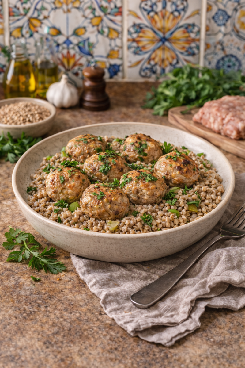 Servir les Boulettes de dinde et sarrasin, parsemer de persil.