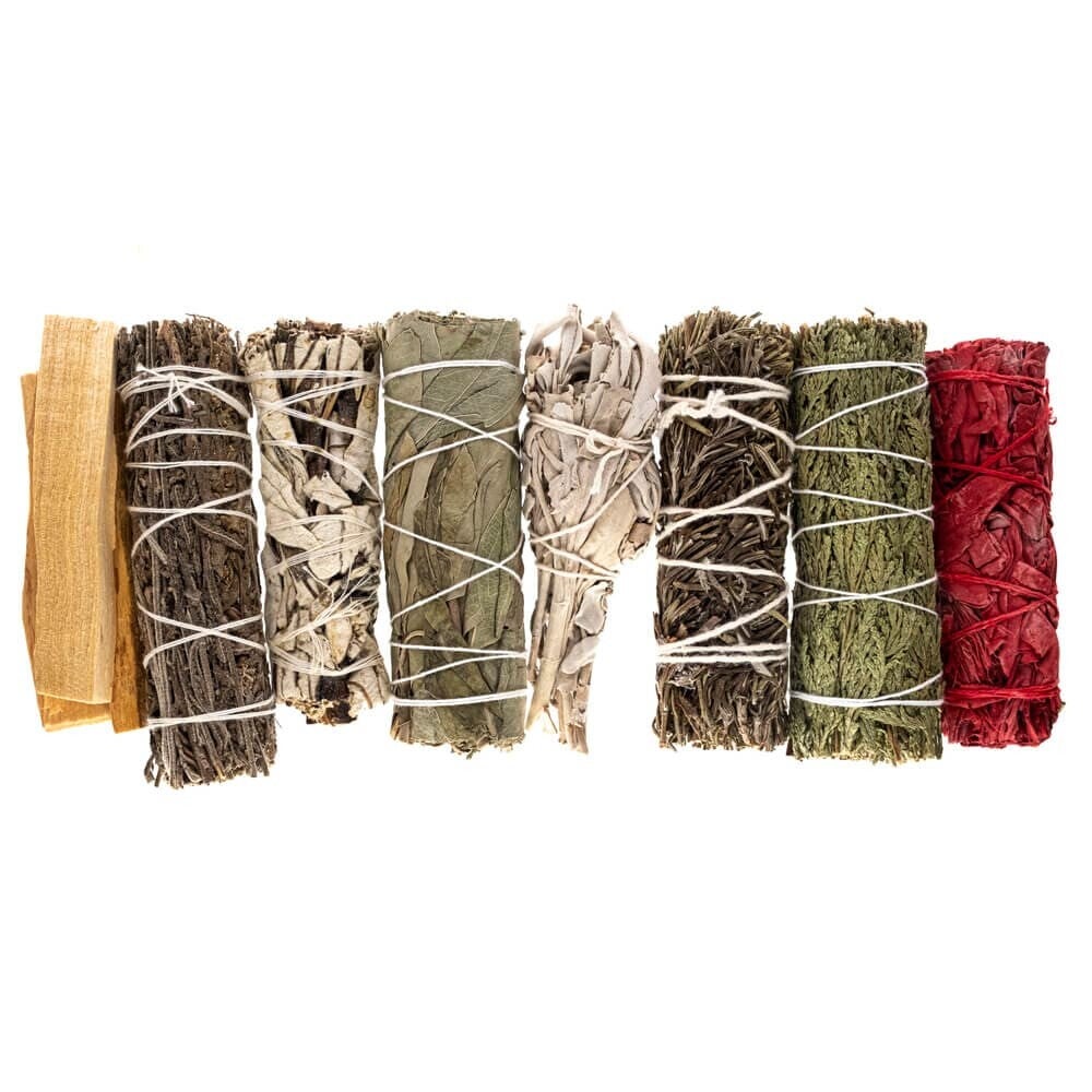 Coffret d'encens naturels : sauge, palo santo, bois de cèdre, sang de dragon, yerba santa, romarin, lavande et eucalyptus.